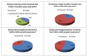 Berdasarkan survey dari 4 buah pertanyaan yang kami ajukan, pendapat mahasiswa mengenai penggunaan facebook dan twitter, sebanyak 34% menempatkan facebook menjadi akses jejaring sosial mereka, 4% memilih twitter, 56% memilih menggunakan facebook dan twitter, dan 6% memilih tidak menggunakan dua-duanya. Kemudian dari hasil polling, diketahui bahwa 22% mahasiswa menyatakan bahwa tingkat kesulitan terletak di facebook, 78% menganggap twitter lebih sulit.
