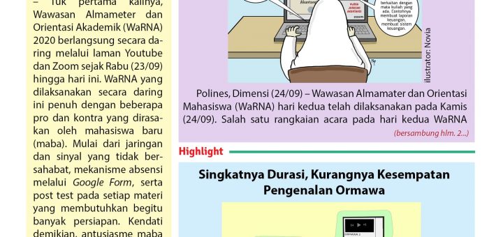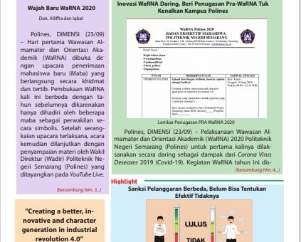 Polines, DIMENSI (26/09) – Pelaksanaan Wawasan Almameter dan Orientasi Akademik (WaRNA) 2020 telah berlangsung selama dua hari berturut-turut sejak Rabu (23/09) dan usai pada Kamis (24/09) lalu. Dengan menimbang pada kondisi pandemi yang belum...